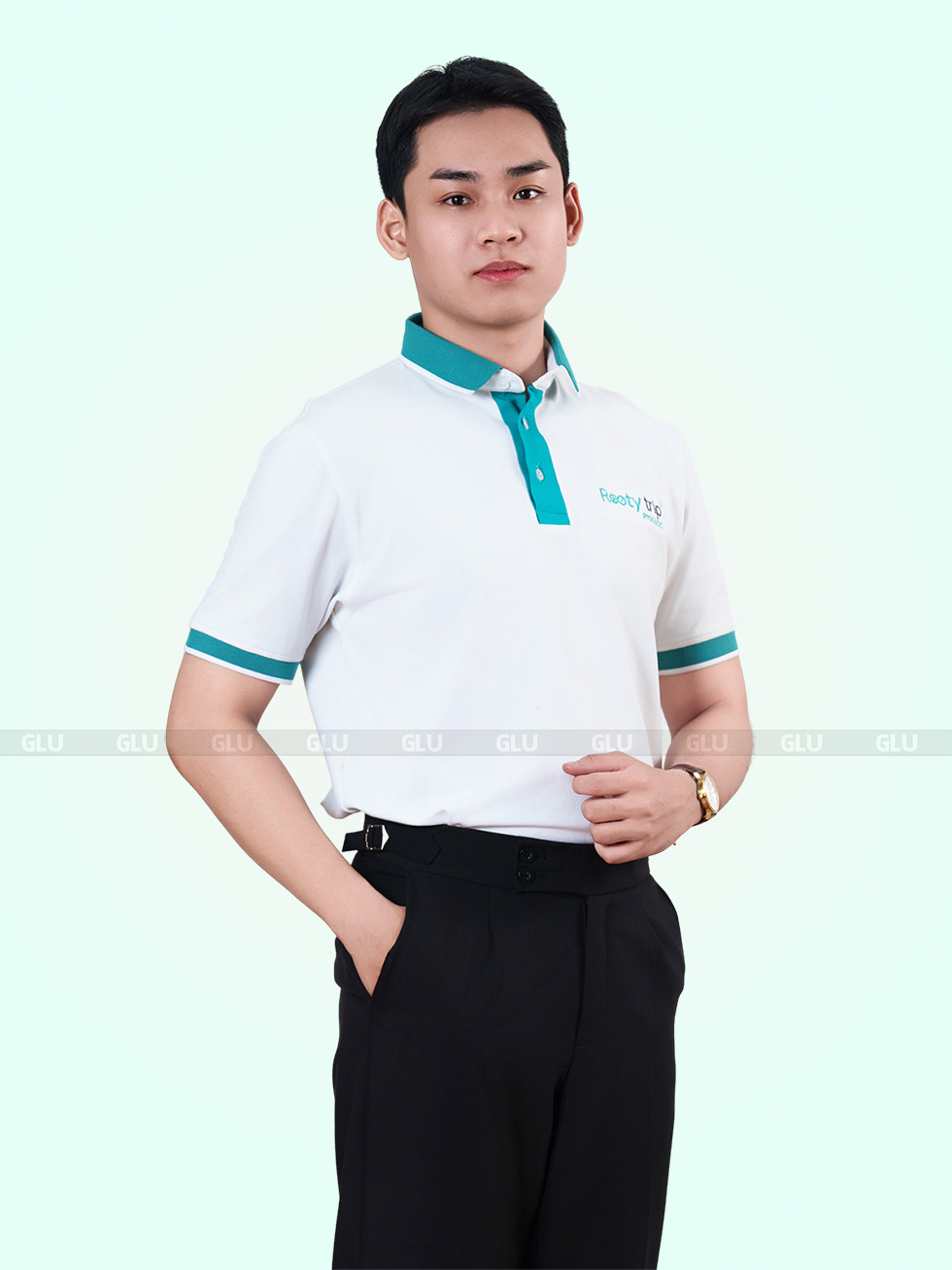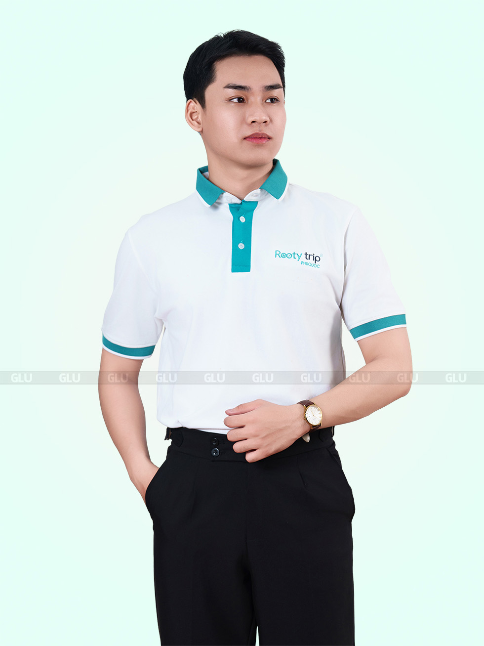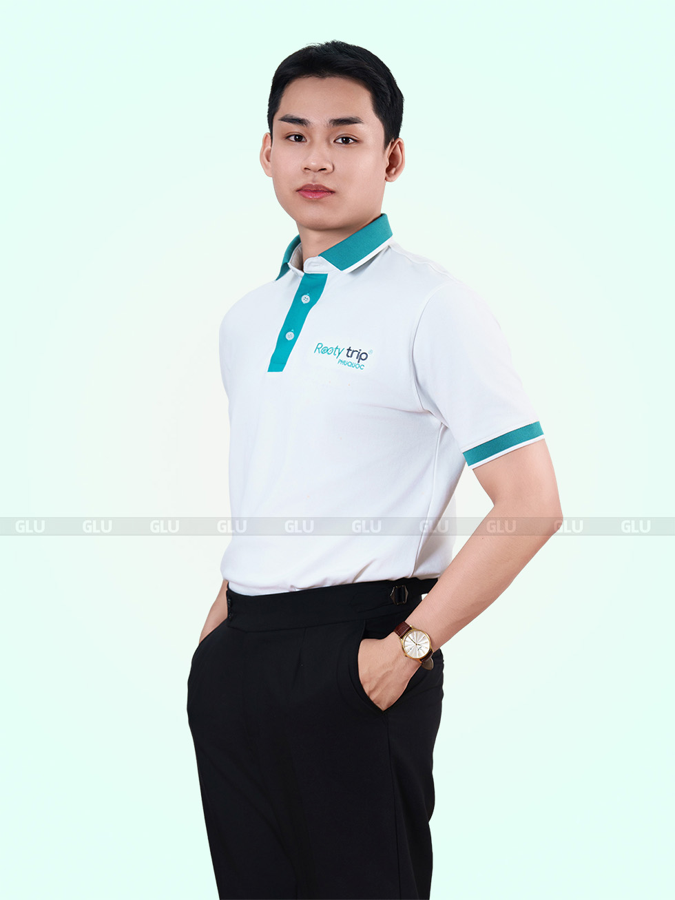 Áo polo đồng phục với sắc trắng tinh khôi, kết hợp hài hòa cùng cổ áo và bo tay màu xanh ngọc tươi sáng. Thiết kế cổ điển với hàng cúc trắng nổi bật trên nền xanh, mang đến vẻ ngoài thanh lịch và sự chuyên nghiệp. Đường viền trắng mảnh trên bo tay áo tạo điểm nhấn tinh tế, hoàn thiện tổng thể trang phục một cách chỉn chu.