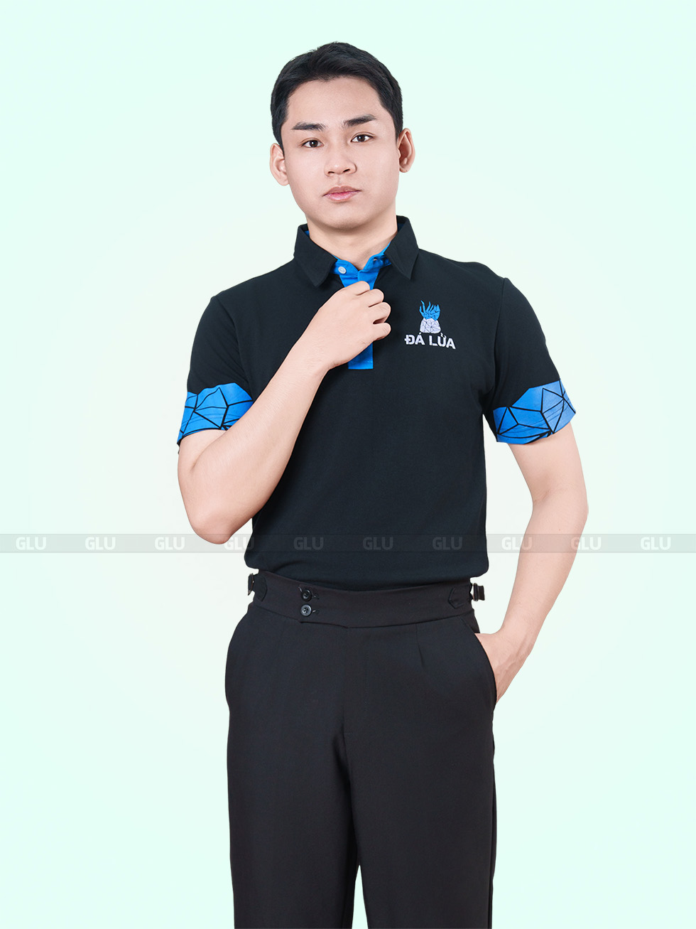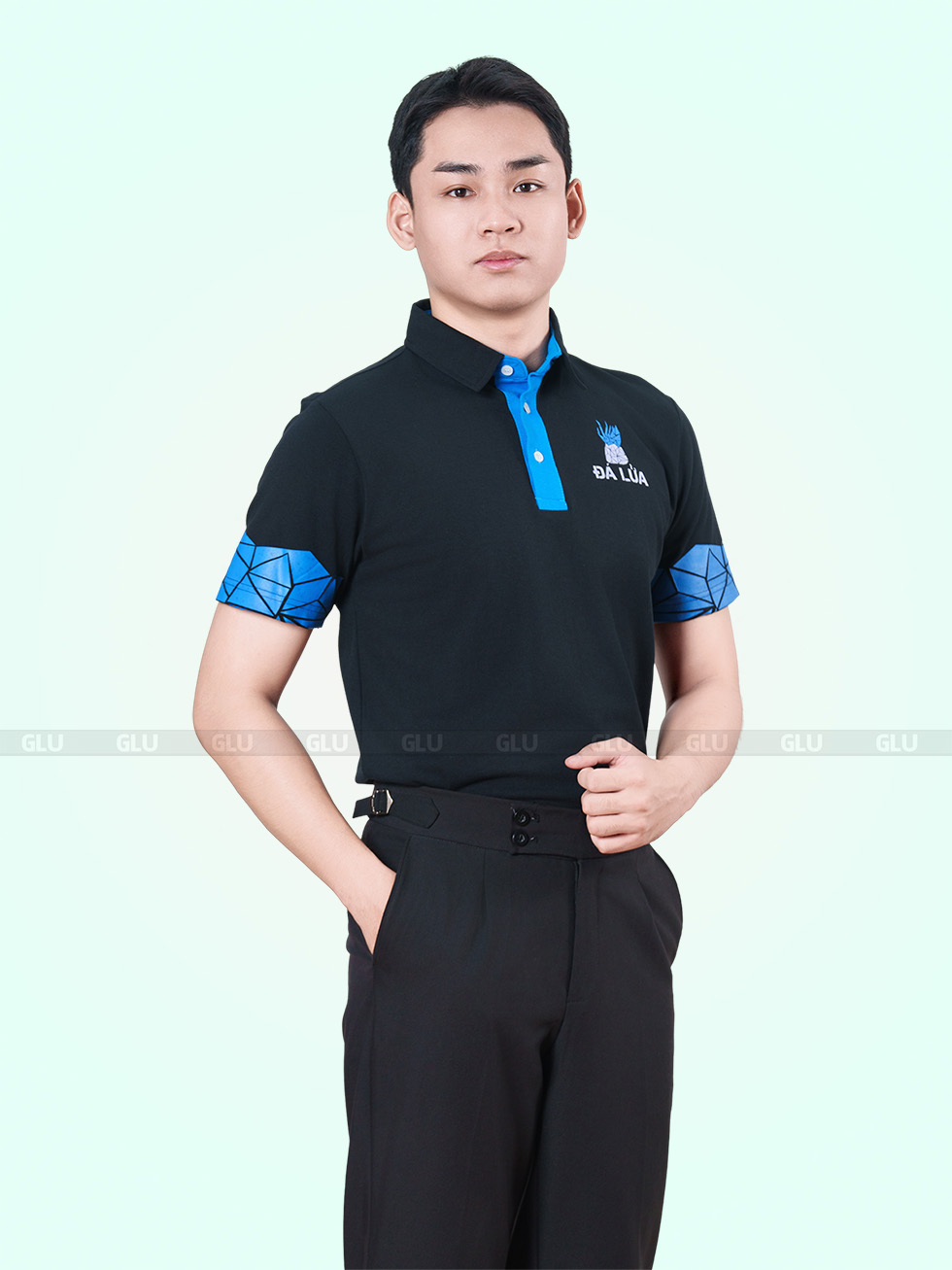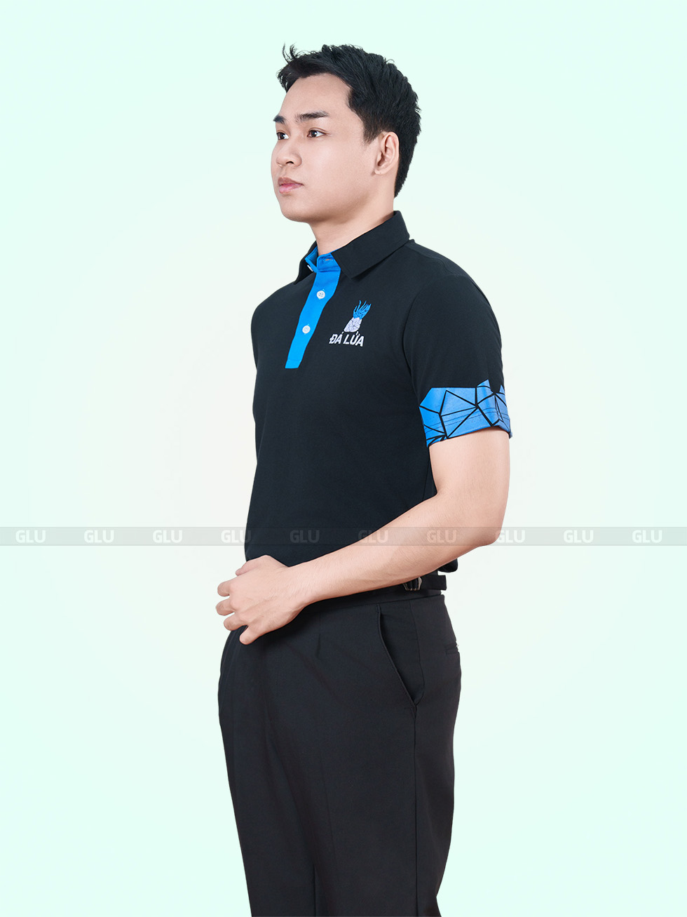 Áo polo đồng phục mang sắc đen mạnh mẽ, kết hợp đầy ấn tượng với những mảng màu xanh dương nổi bật. Cổ áo đen lịch lãm cùng đường viền xanh ở trụ áo và phần tay áo được thiết kế họa tiết hình khối độc đáo màu xanh dương, tạo nên phong cách hiện đại và phá cách. Kiểu dáng polo cổ điển cùng form ôm vừa vặn, toát lên vẻ năng động và chuyên nghiệp.