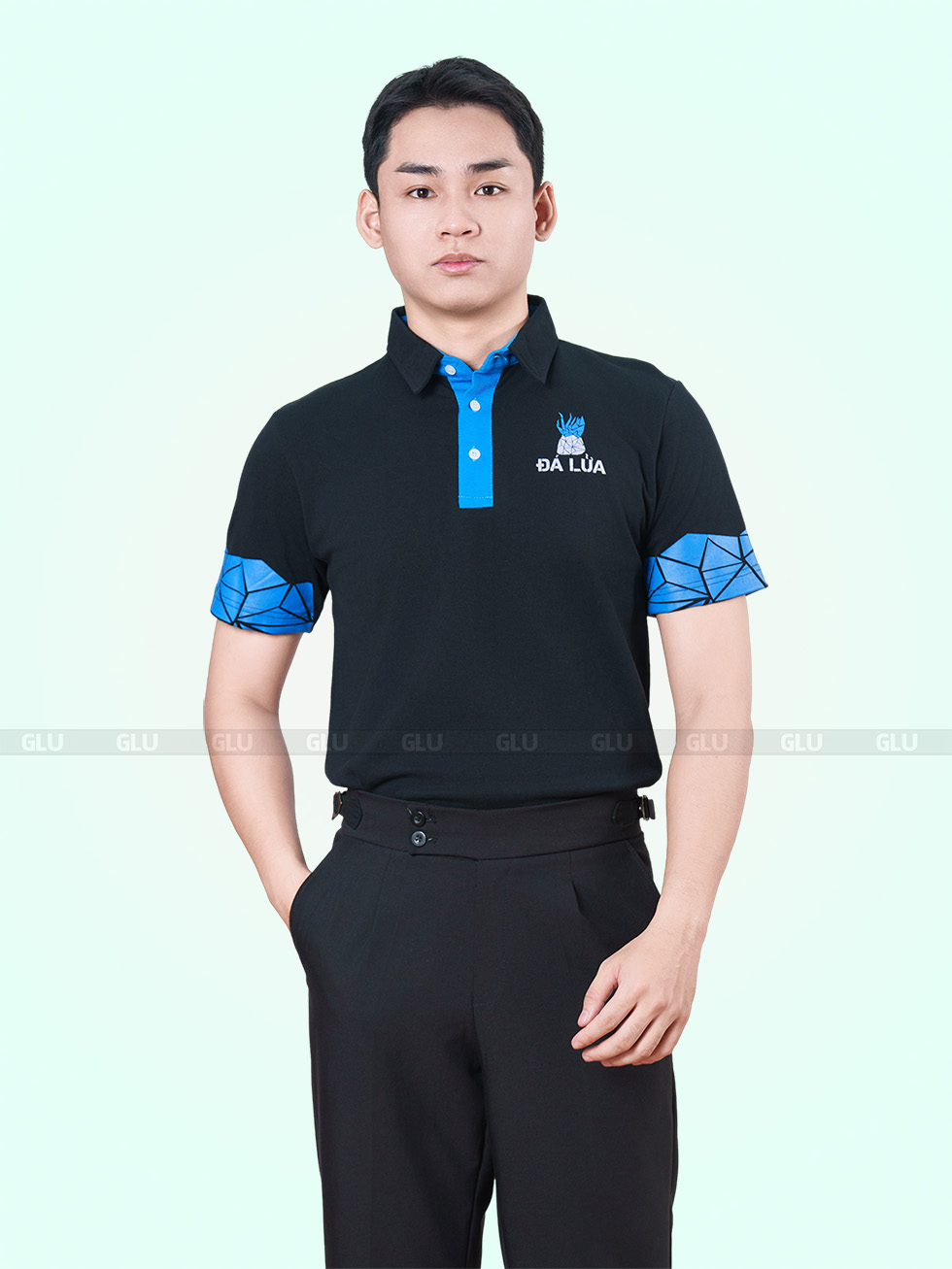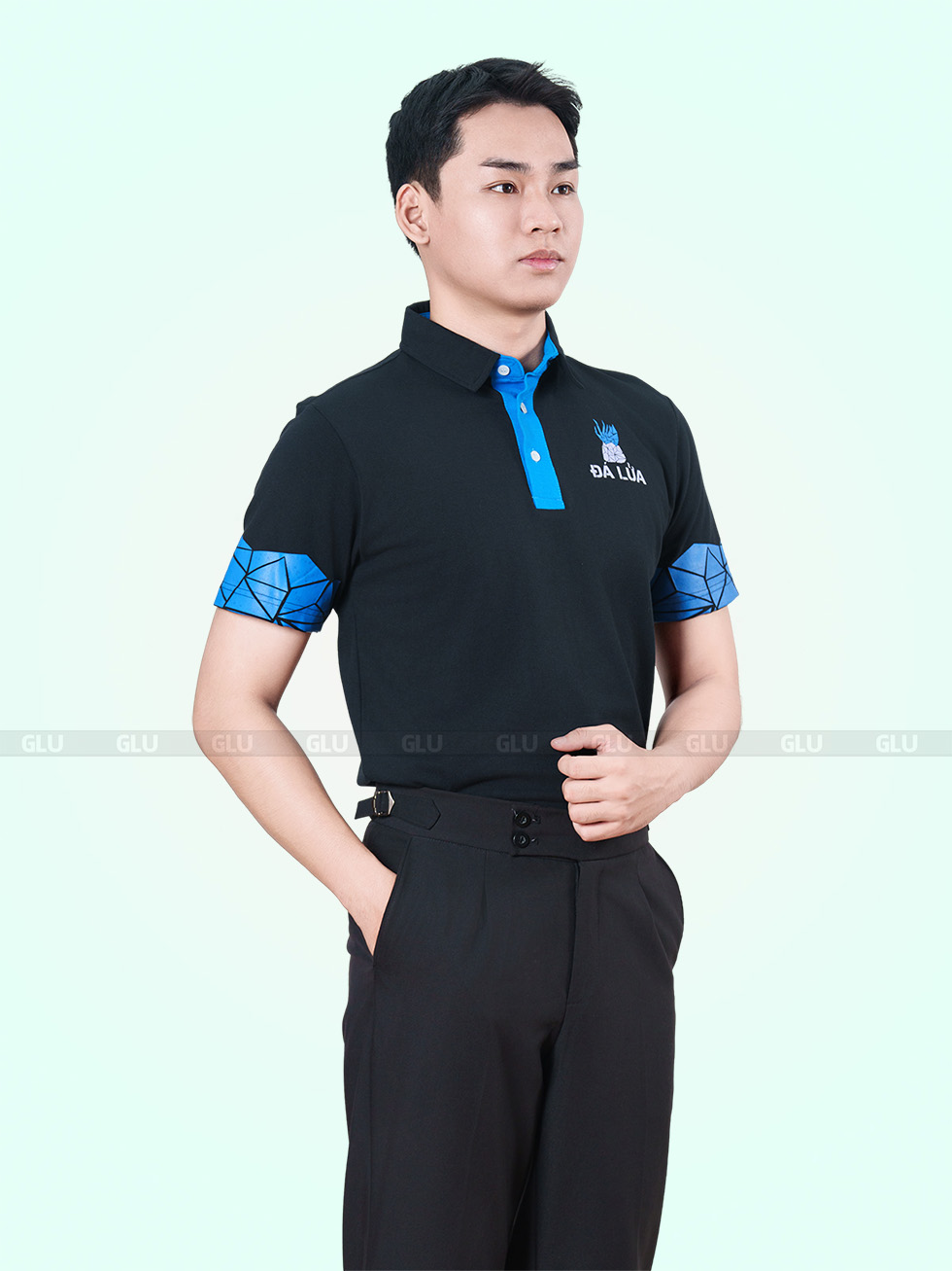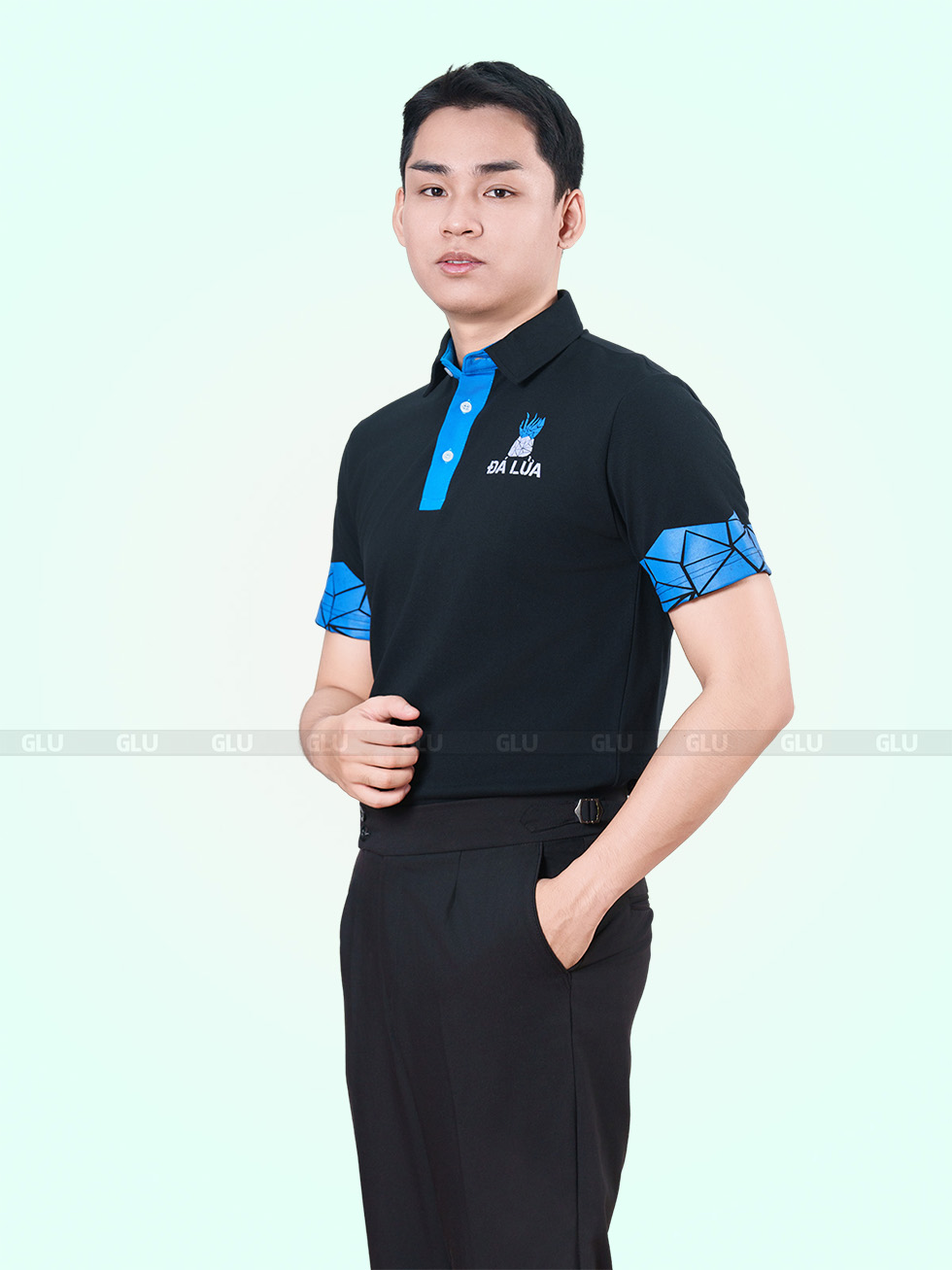 Áo polo đồng phục mang sắc đen mạnh mẽ, kết hợp đầy ấn tượng với những mảng màu xanh dương nổi bật. Cổ áo đen lịch lãm cùng đường viền xanh ở trụ áo và phần tay áo được thiết kế họa tiết hình khối độc đáo màu xanh dương, tạo nên phong cách hiện đại và phá cách. Kiểu dáng polo cổ điển cùng form ôm vừa vặn, toát lên vẻ năng động và chuyên nghiệp.
