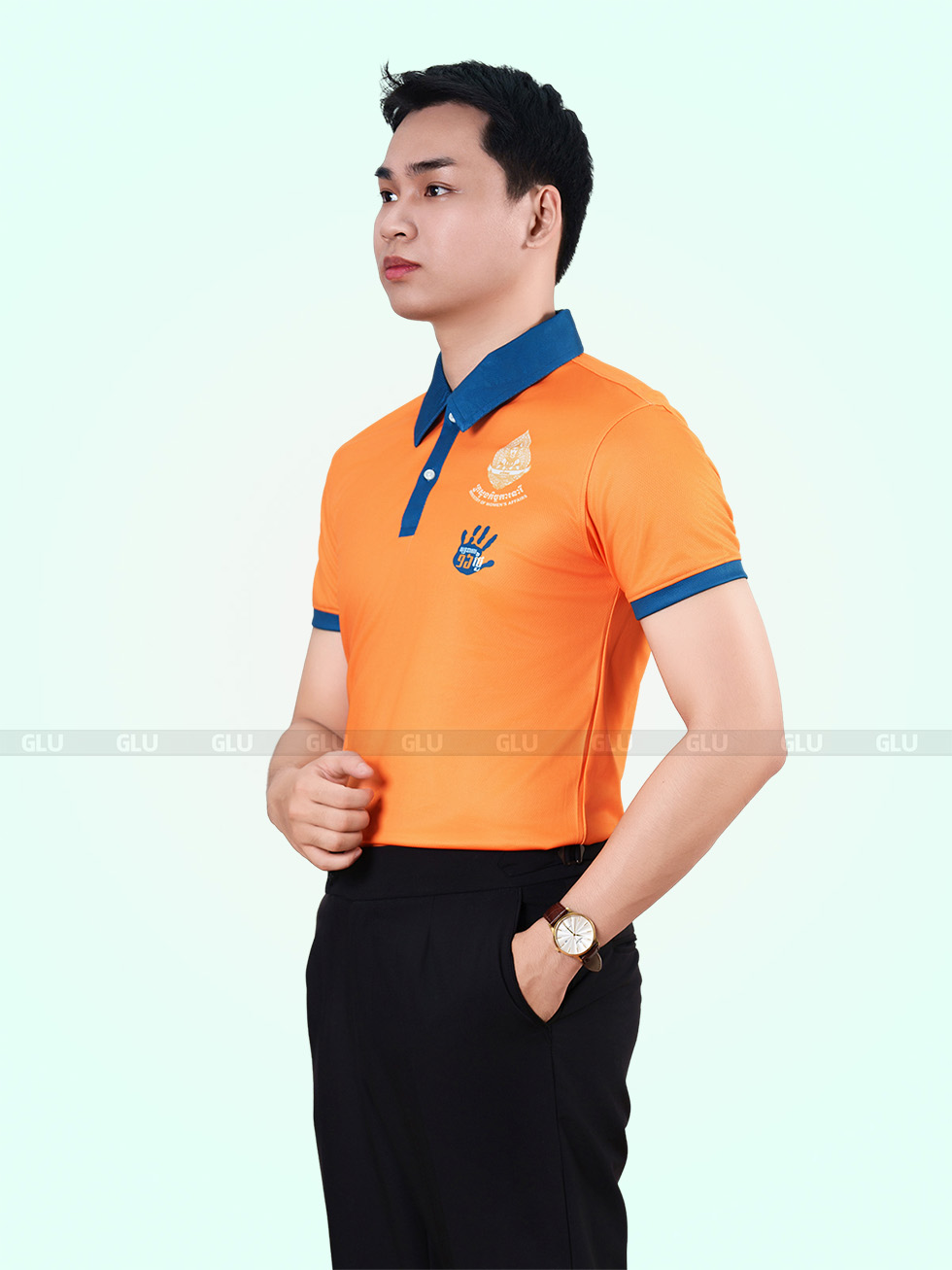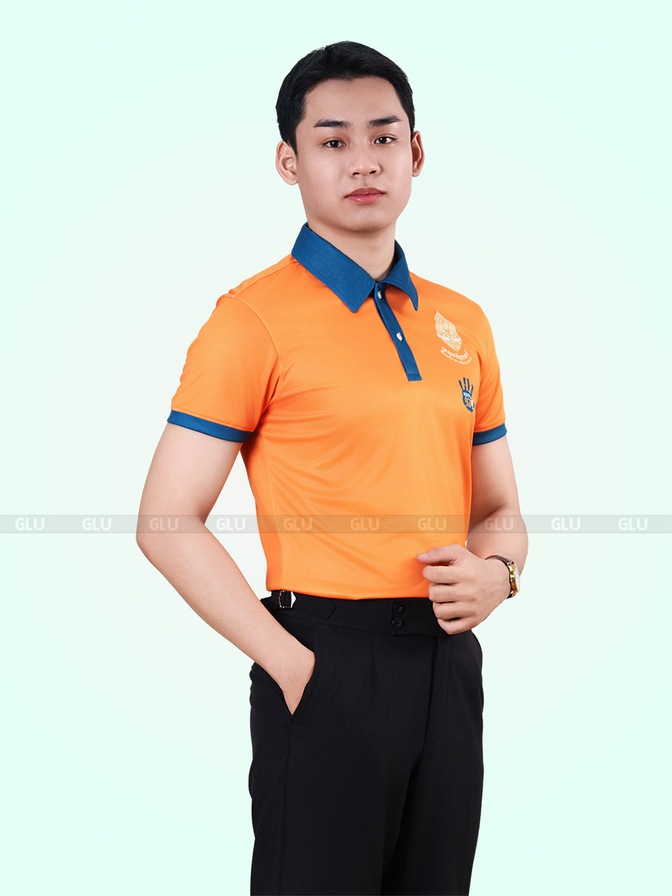 Áo polo đồng phục với sắc cam tươi sáng đầy năng lượng, kết hợp hài hòa cùng cổ áo và bo tay màu xanh navy đậm. Thiết kế phối màu tương phản mạnh mẽ, tạo điểm nhấn cuốn hút và mang lại vẻ ngoài năng động, chuyên nghiệp. Cổ áo lịch sự cùng hàng cúc trắng nổi bật trên nền xanh, hoàn thiện tổng thể trang phục một cách tinh tế.