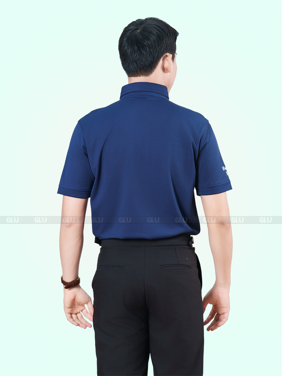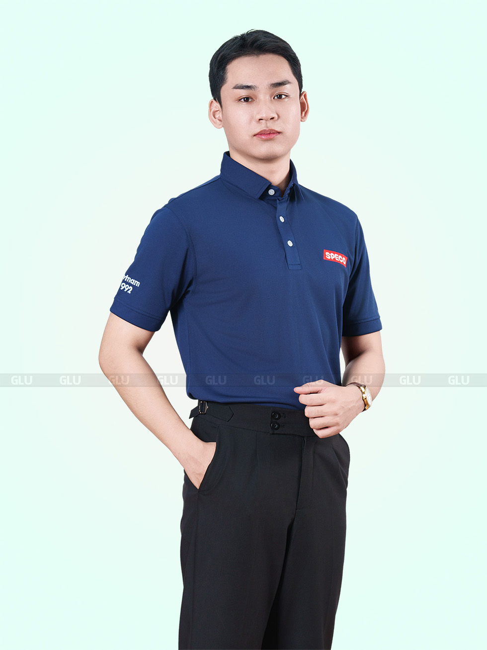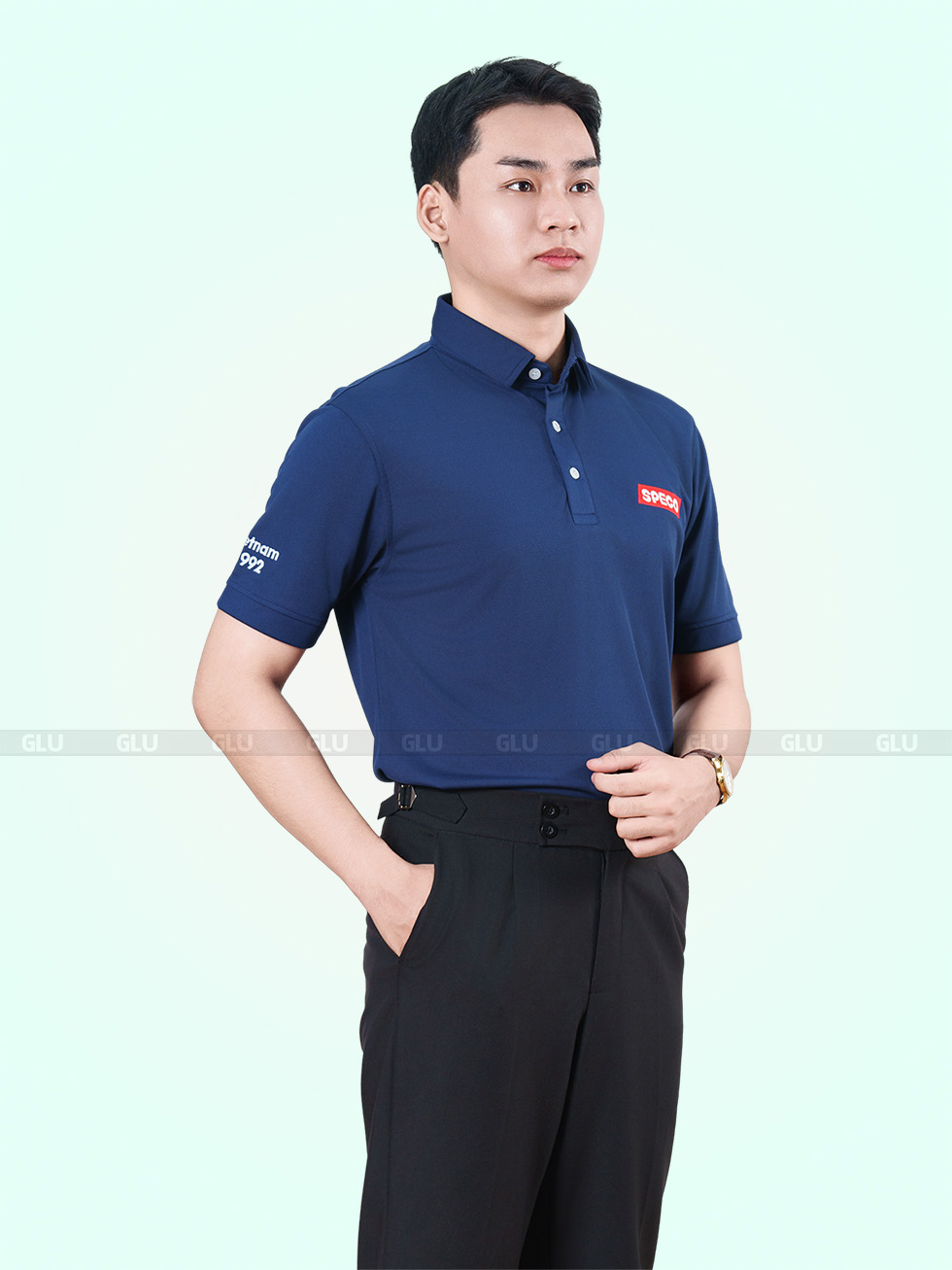 Tone xanh navy luôn giữ được sự lịch sự nhưng không hề khô khan, đặc biệt khi kết hợp với logo đỏ trắng nổi bật bên ngực trái. Cổ áo được thiết kế ba khuy gài, giữ form gọn gàng nhưng không quá cứng nhắc. Tay áo ngắn, form suông thoải mái dễ vận động – rất hợp cho các môi trường công sở năng động, kỹ thuật, kho vận hoặc đội nhóm thường xuyên di chuyển.