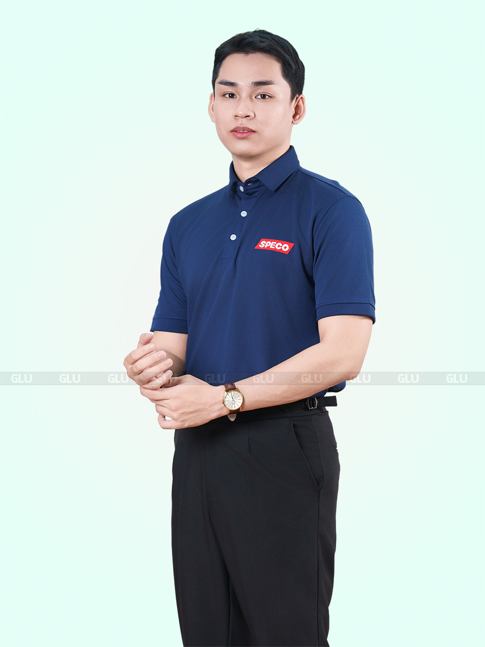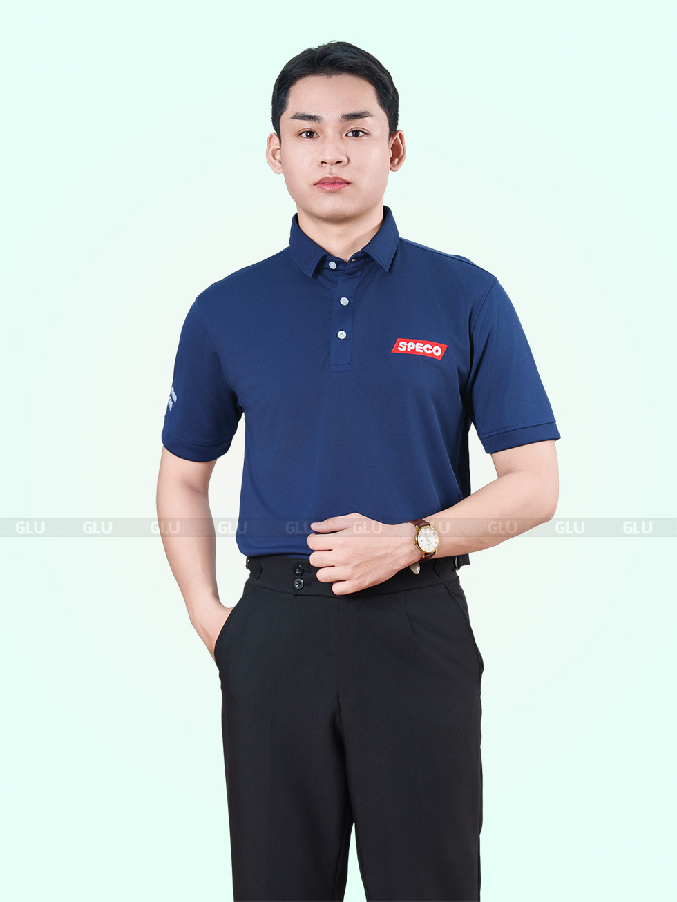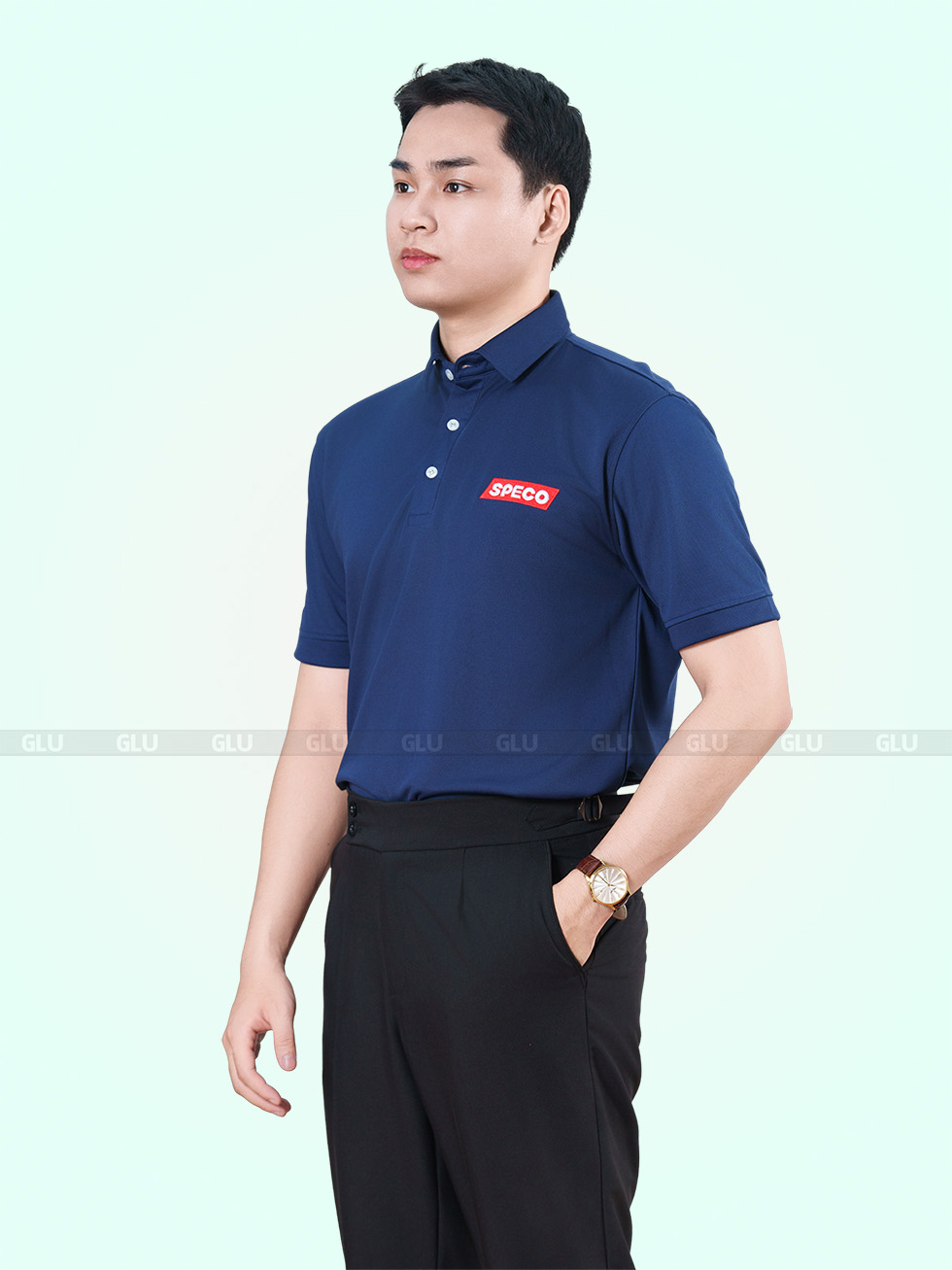 Tone xanh navy luôn giữ được sự lịch sự nhưng không hề khô khan, đặc biệt khi kết hợp với logo đỏ trắng nổi bật bên ngực trái. Cổ áo được thiết kế ba khuy gài, giữ form gọn gàng nhưng không quá cứng nhắc. Tay áo ngắn, form suông thoải mái dễ vận động – rất hợp cho các môi trường công sở năng động, kỹ thuật, kho vận hoặc đội nhóm thường xuyên di chuyển.
