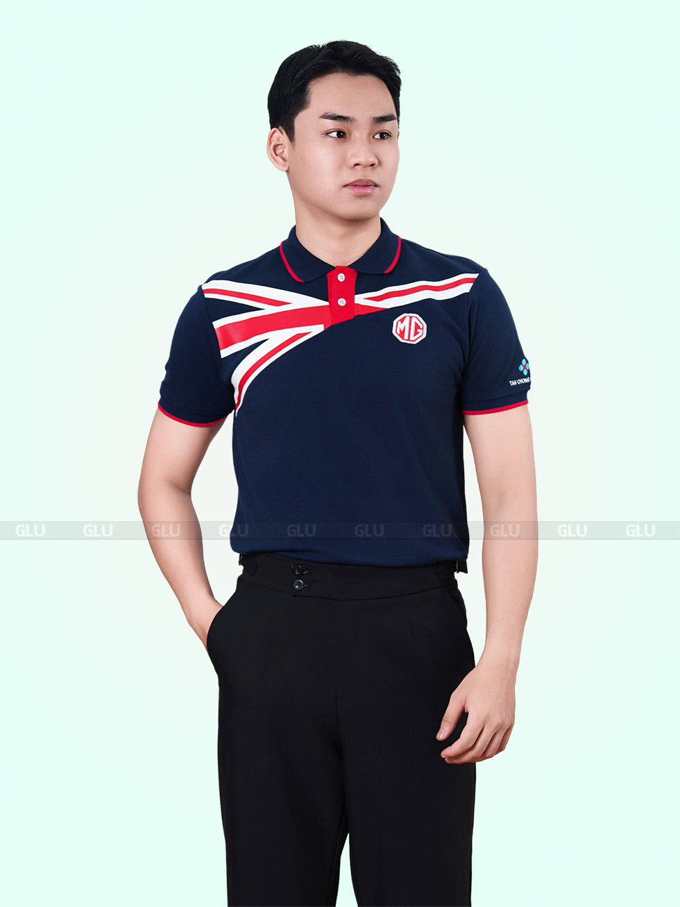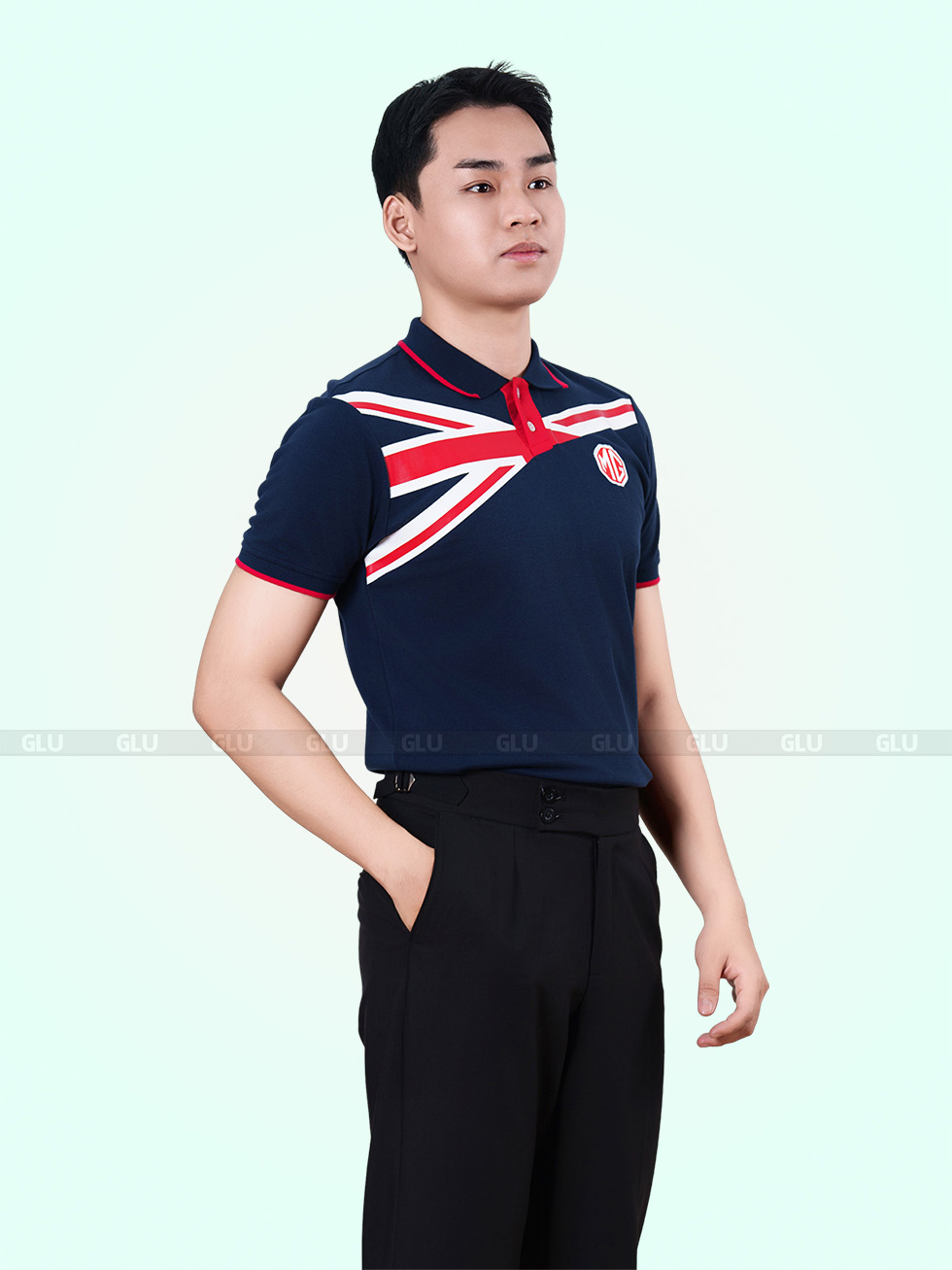 Áo polo đồng phục với sắc xanh navy chủ đạo, kết hợp mạnh mẽ cùng họa tiết cờ Anh màu đỏ và trắng nổi bật ở phần ngực và vai áo, tạo nên phong cách độc đáo, đầy cá tính. Cổ áo và bo tay được viền đỏ tinh tế, hoàn thiện vẻ ngoài năng động và thu hút. Thiết kế này mang đến sự khác biệt rõ rệt so với các mẫu đồng phục thông thường.