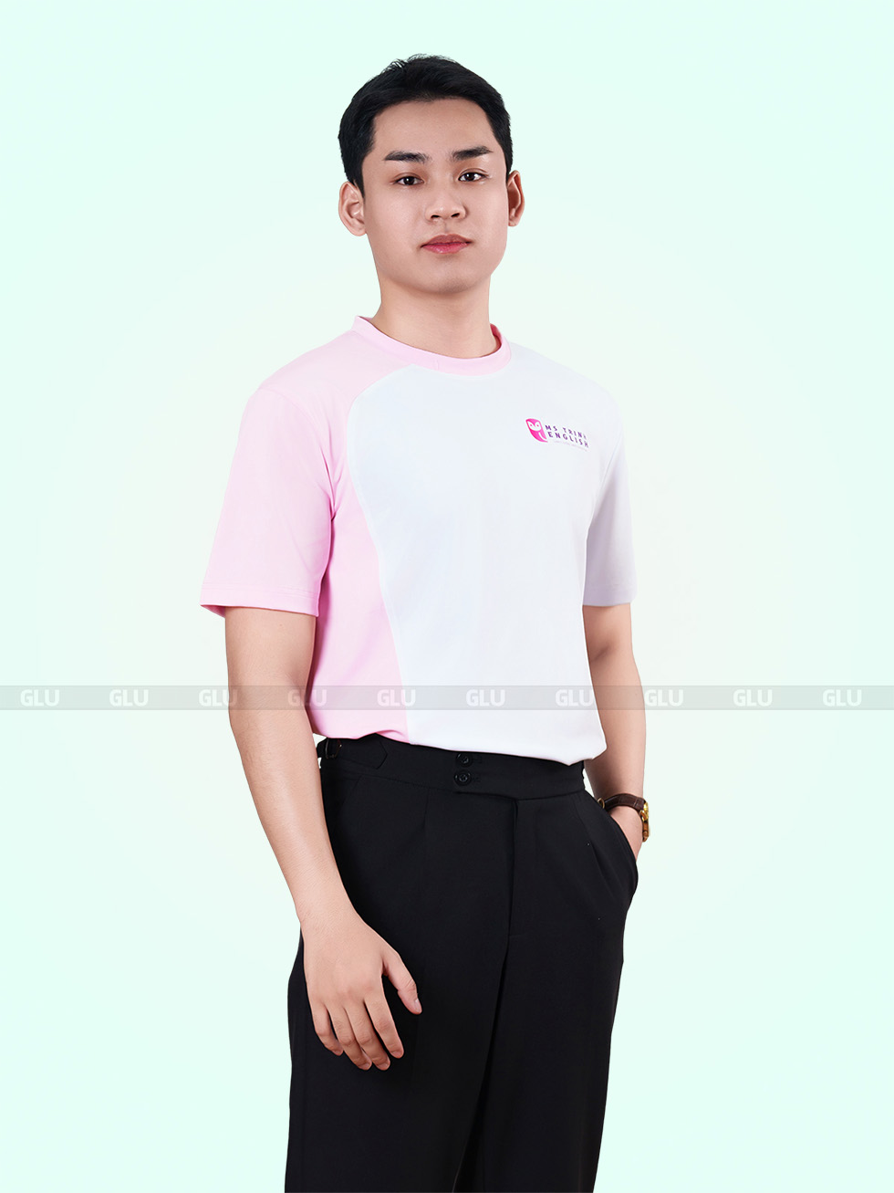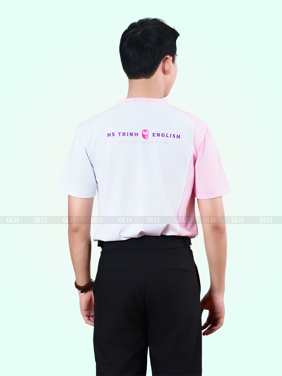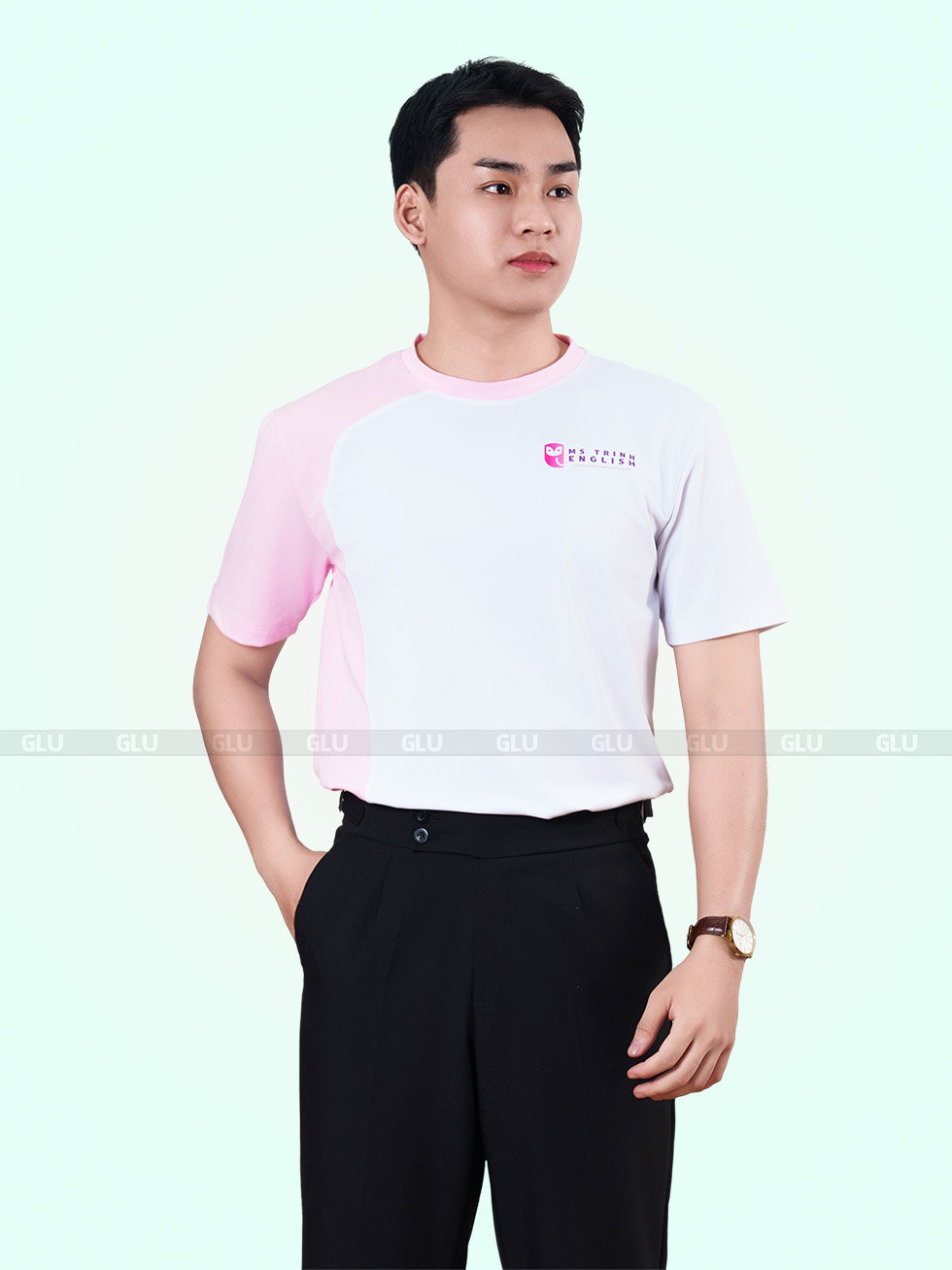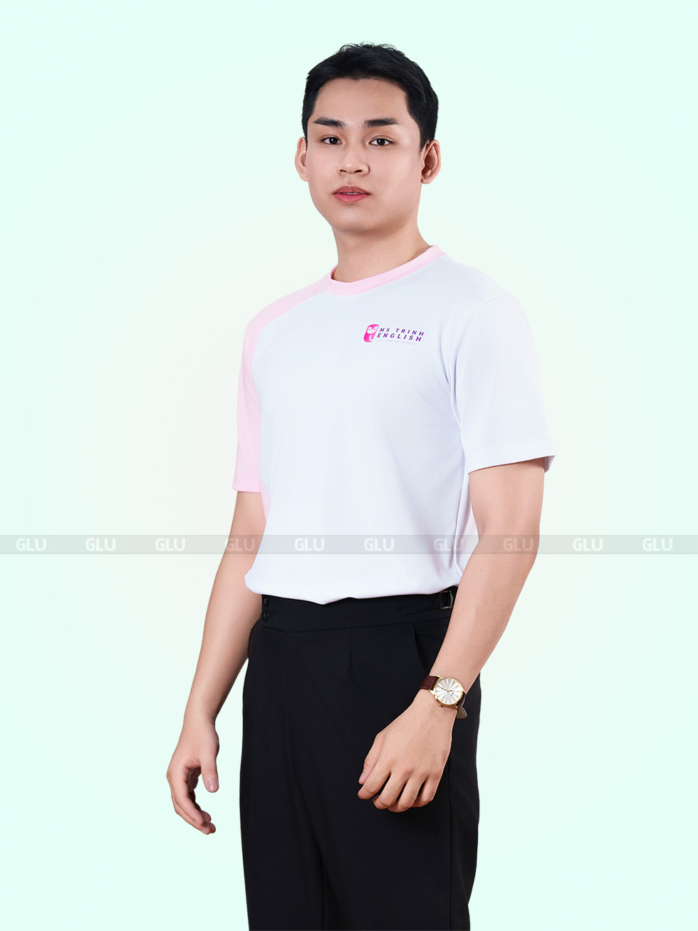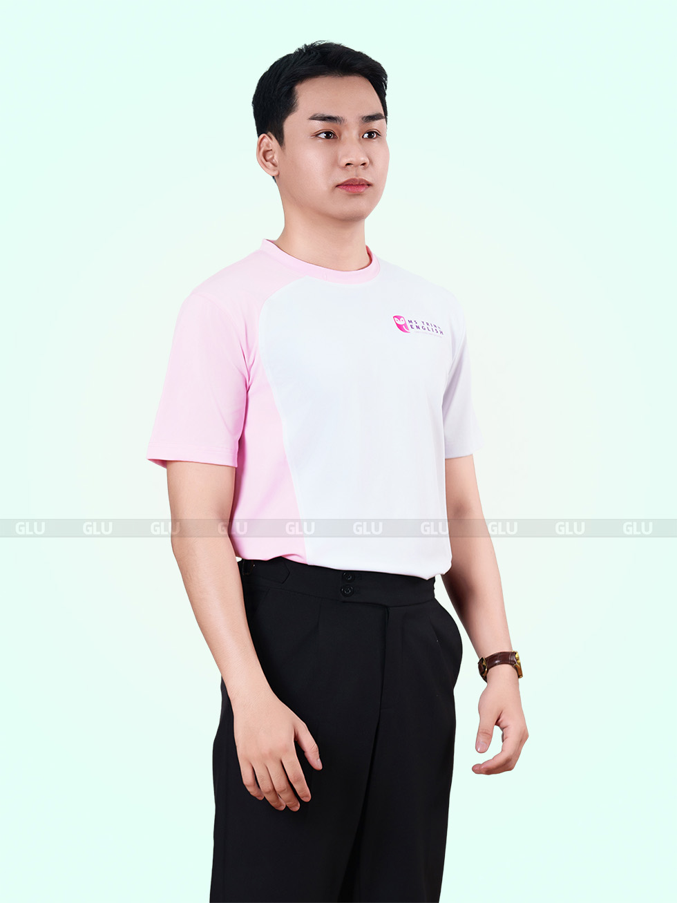 Áo thun đồng phục với sắc trắng tinh khôi, kết hợp hài hòa cùng mảng màu hồng pastel dịu nhẹ ở vai và tay áo bên trái, tạo nên vẻ ngoài mềm mại và hiện đại. Thiết kế cổ tròn thoải mái cùng phom áo suông, mang lại sự năng động và dễ chịu cho người mặc trong mọi hoạt động. Sự kết hợp màu sắc này đặc biệt nổi bật và thân thiện.