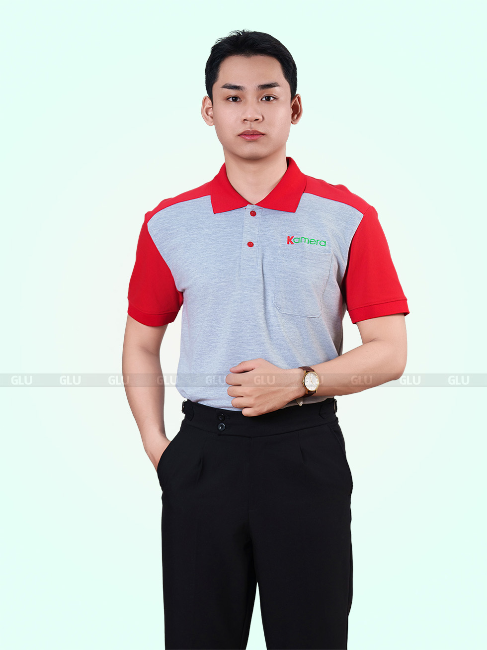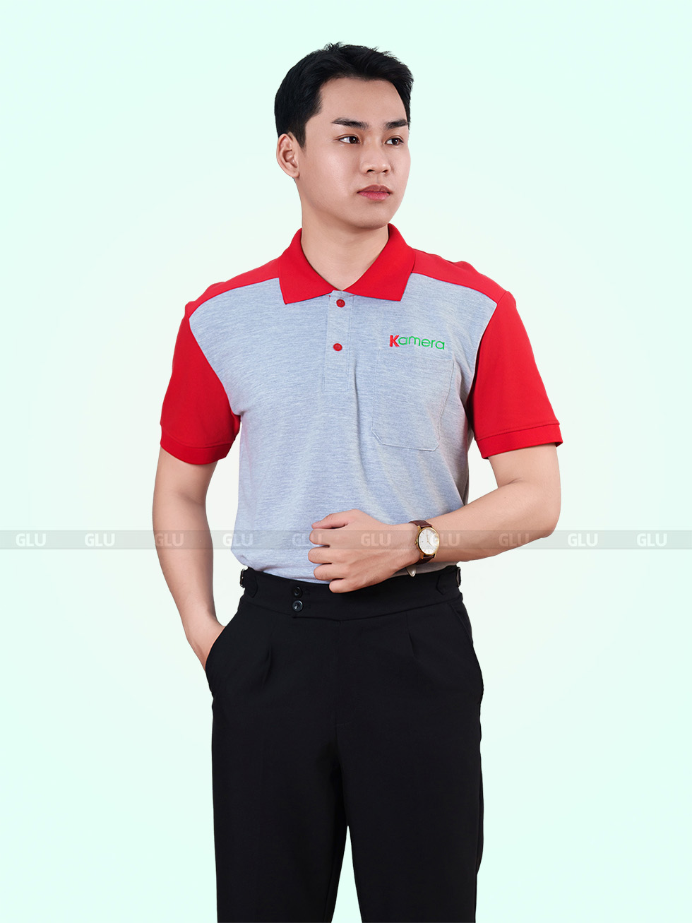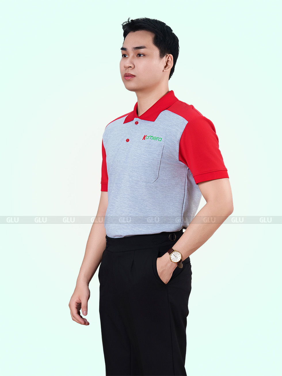 Chiếc áo polo đồng phục này mang đến sự kết hợp đầy ấn tượng giữa sắc đỏ nổi bật ở vai và tay áo, cùng gam màu xám trung tính ở thân áo. Thiết kế tạo nên vẻ ngoài năng động nhưng vẫn giữ được sự chuyên nghiệp, phù hợp với nhiều ngành nghề. Cổ áo đỏ truyền thống và trụ áo xám nhã nhặn hoàn thiện phong cách tinh tế.