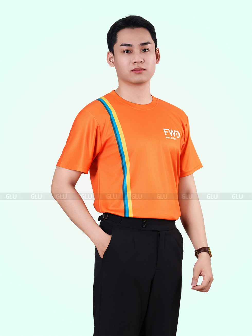 Cam rực rỡ chiếm trọn ánh nhìn ngay từ lần đầu chạm mắt. Thiết kế cổ tròn cơ bản tạo sự thoải mái cho người mặc, kết hợp với các đường may dứt khoát mang đến tổng thể gọn gàng, khỏe khoắn. Điểm nổi bật chính là mảng phối màu độc đáo chạy chéo từ vai trái xuống thân áo, gồm ba gam xanh dương – vàng – đen xếp lớp, tạo hiệu ứng thị giác mạnh mẽ mà không làm rối bố cục.